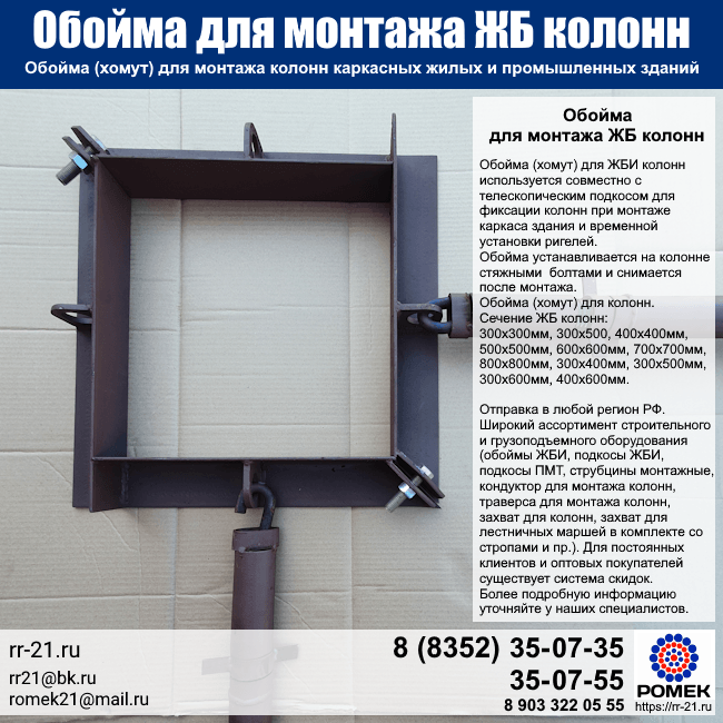 Отправка по РФ. Бесплатная доставка до терминала ТК. Собственное производство. Широкий ассортимент строительного и грузоподъемного оборудования (обоймы ЖБИ, подкосы ЖБИ, подкосы ПМТ, струбцины монтажные, кондуктор для монтажа колонн, траверса для монтажа колонн, захват для колонн, захват для лестничных маршей в комплекте со стропами и пр.). Более подробную информацию уточняйте у наших специалистов.