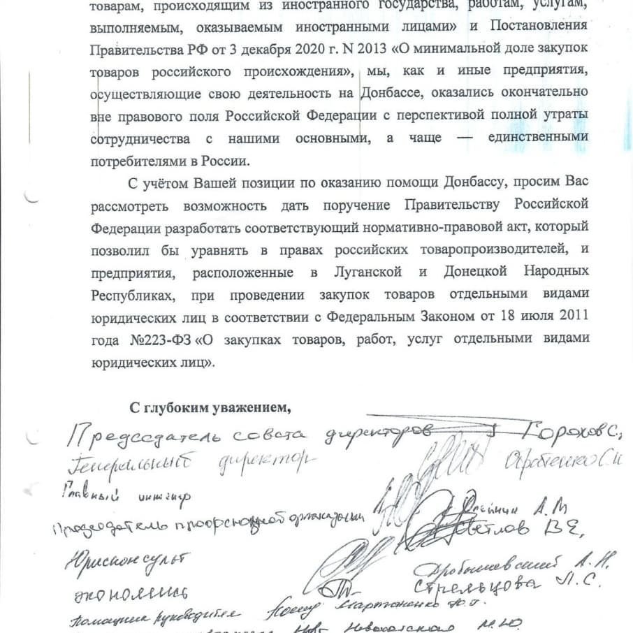 Еще 24 февраля 2021 года в приемную Президента Российской Федерации в Москве Председателем Совета директоров ЛЗТА «Маршал» Гороховым С. А. было подано коллективное письмо, подписанное 400 сотрудниками завода «Маршал» (граждан Российской Федерации), с просьбой приравнять предприятия ЛНР и ДНР к российским производителям.